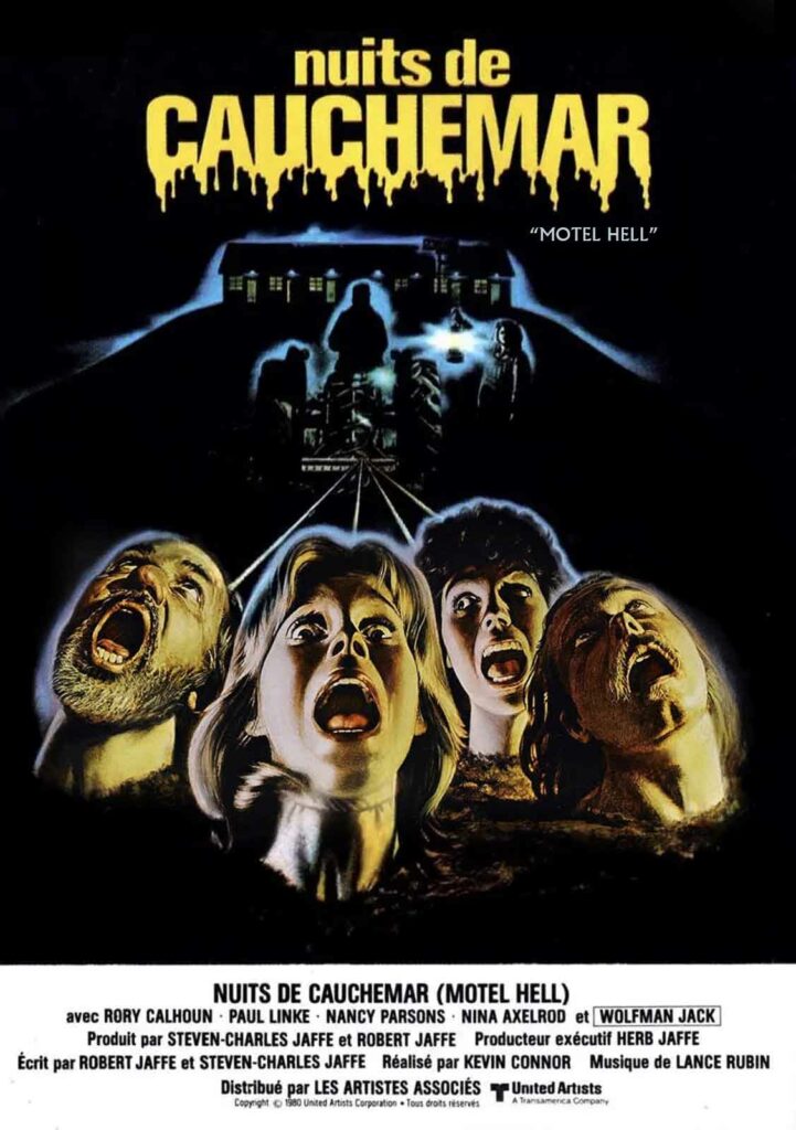 Quant au final, il est carrément dantesque, puisqu’il commence comme une variante de La Nuit des Morts-Vivants, les martyrs aphones s’extrayant de la terre pour réclamer vengeance d’un pas traînant, puis s’achève à la façon d’un remake burlesque de La Guerre des étoiles, les sabres laser se muant ici en tronçonneuses et le casque de Dark vador ayant été troqué contre une tête de cochon ! Massacre à la tronçonneuse est aussi bien sûr en ligne de mire de ce dénouement outrancièrement parodique. Le titre original, qui joue sur les mots « Hell » et « Hello », trouve son écho visuel dans l’enseigne au néon du fameux motel, dont le dernier « o » ne s’allume plus, annonçant implicitement que l’accueil chaleureux des joyeux fermiers dissimule une véritable plongée aux enfers. Le titre français, hélas, se prive de cet astucieux calembour au profit d’un Nuits de cauchemar passe-partout.