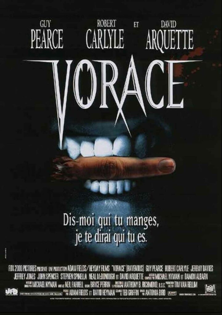 Habituée jusqu’alors aux drames intimistes et contemporains pour le petit et le grand écran, la réalisatrice Antonia Bird nous surprend dans un registre qui semblait lui être jusqu’alors étranger, à mi-chemin entre la reconstitution historique et le film d’horreur. Guy Pearce, futur amnésique de Memento, et Robert Carlyle, strip-teaser amateur de The Full Monty, nous offrent des prestations tout à fait étonnantes, et portent à eux deux toute l’intensité de cette inquiétante fable. Leur affrontement final, excessif et dantesque, voit sa violence compensée par le cynisme du ton. A leurs côtés, Jeffrey Jones (comédien calamiteux dans Ed Wood) et David Arquette (policier maladroit dans Scream) campent de fort pittoresques soldats. Les décors naturels magnifiques captés en République Tchèque, la mise en scène nerveuse à souhaits et une bande originale folklorique jouant volontiers les contrepoints achèvent de faire de Vorace une œuvre fort curieuse qui regorge d’idées et d’intérêt.