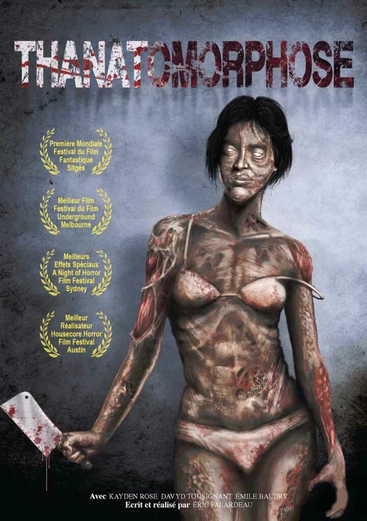 Le déroulement de cette première phase est donc à l’image de la vie de Laura : morne, sans vraiment de vie. Un passage néanmoins nécessaire (et voulu !) puisqu’on entre littéralement dans la peau de la jeune femme, on a l’impression de vivre son quotidien, de s’ennuyer autant qu’elle, de trouver son petit ami con et macho. Une première phase qui nous prépare sans qu’on le remarque vraiment à la seconde, celle où les choses s’accélèrent et où le sort de Laura va nous prendre aux tripes. Avec l’accélération du pourrissement du corps de Laura, Eric Falardeau fait alors bifurquer inexorablement son film dans une horreur crue, maladive, sans rémission. La dégradation physique du corps de Laura s’accompagne des superbes effets spéciaux et de maquillages de David Scherer et on ressent dans sa chair le pourrissement. On pense à des films comme La Mouche ou Moi, Zombie, Chronique de la douleur par exemple. Devenir un cadavre vivant, bardé d’asticots, tel est le triste sort de Laura et rien ne nous est épargné, tout est filmé frontalement et l’aspect nauséeux, répulsif, ne cesse de progresser. Thanatomorphose est donc un film « autre », qui connaît un succès grandissant dans les festivals où il est présenté, récoltant sans cesse de nombreux prix. Bref, faites l’effort d’explorer une autre face du cinéma d’horreur, faites l’effort de tenter une autre expérience et de donner sa chance au cinéma indépendant. Vous ne le regretterez pas et il est sûr que certaines images vont longtemps vous trotter en tête.