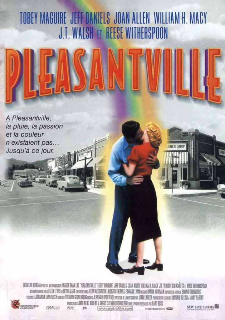 La télévision agit ici comme un tunnel entre deux mondes qui, à priori, n’auraient jamais dû se rencontrer, l’un étant le miroir déformant et fantasmé de l’autre. Et lorsque Jennifer, acceptant de jouer le jeu au cours d’un rendez-vous galant, fait découvrir le sexe à son partenaire, tout l’univers de Pleasantville se détraque. La visualisation de ce dérèglement est un véritable coup de génie : une touche de couleur dans un monde uniformément noir et blanc. Dès lors, chaque fois que la subversion ou l’anticonformisme montrent le bout de leur nez, les teintes vives éclosent un peu partout : une rose rouge, un chewing-gum rose, une voiture verte, un peigne jaune… La beauté de cette idée narrative et la perfection des effets numériques ne rendent que plus puissant le message véhiculé par un scénario résolument surprenant, qu’on pourrait simplifier en ces termes : « vive la différence ! » Du coup, même s’il n’a rien d’un film de science-fiction spectaculaire, Pleasantville est à l’époque le long-métrage contenant le plus de plans truqués de l’histoire du cinéma (environ 1700, supervisés par Chris Watts), un record qui sera battu l’année suivante avec La Menace Fantôme de George Lucas.