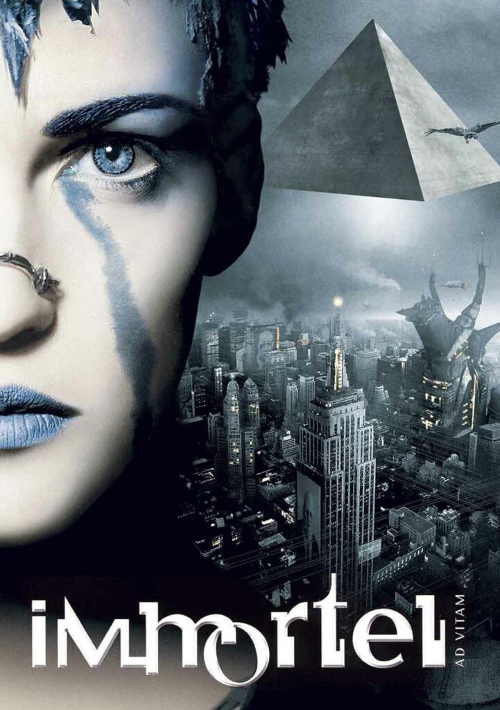 Décidément, l’univers d’Enki Bilal passe difficilement le cap du grand écran. Car si Immortel (Ad Vitam) s’avère moins austère que Bunker Palace Hotel et bien plus abouti que Tykho Moon, il en conserve le même travers principal : une terrible froideur, certes appropriée au papier glacé des BD du dessinateur mais rédhibitoire au sein d’un long-métrage censé impliquer et émouvoir ses spectateurs. Inspiré par les splendides albums « La Foire aux Immortels » (1980) et « La Femme Piège » (1986), le scénario nous entraîne dans le New York de 2095, en pleine campagne électorale. Dans ce futur extrêmement graphique, la ville est peuplée de mutants, d’extra-terrestres et d’humains réels ou synthétiques. Au milieu d’un ciel sans cesse survolé de véhicules en tout genre surgit soudain une gigantesque pyramide habitée par trois dieux égyptiens. Tandis que Bastet, la femme-chat, et Anubis, l’homme-chacal, entament une partie d’échecs, Horus, l’homme à tête de rapace, gagne la Terre à la recherche d’une enveloppe corporelle humaine. Il trouve son bonheur auprès de Nikopol, un prisonnier dont il orchestre l’évasion. En habitant son corps, il le force à rencontrer et aimer Jill, une femme mutante dont les cheveux et les larmes arborent une étrange couleur bleue. Le but d’Horus est de s’assurer une divine filiation. Violeur malgré lui, Nikopol va peu à peu tomber amoureux de la belle, un sentiment réciproque qui bouleverser les plans du tout puissant Horus.