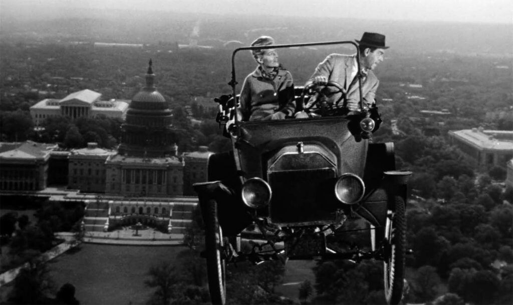 Vétéran des écrans depuis la fin des années 1920, Fred MacMurray n’est pas exactement un jeune premier lorsqu’il tient la vedette de Monte là-d’ssus, surtout face à sa fiancée dans le film, qui est de vingt ans sa cadette et pourrait presque jouer sa fille. Mais il faut reconnaître que la défroque du savant totalement perdu dans ses réflexions, dont chaque explication floue et nébuleuse l’isole du reste du monde, lui va comme un gant. Seul son chien Charlie semble du reste l’écouter d’une oreille distraite. Pour se conformer aux folies du scénario, les effets spéciaux supervisés par Robert A. Mattey et Eustace Lycett déploient tout l’arsenal disponible, des incrustations aux objets suspendus par des fils en passant par les éléments en dessin animé, les rétro-projections, les cascadeurs portant des harnais et les maquettes. Le film ne manque donc pas de morceaux de bravoure, notamment le match de basket d’anthologie où les joueurs sont en apesanteur, l’interminable bondissement du cupide Hawk (Keenan Wynn) qui se transforme en attraction locale et bien sûr les nombreuses envolées de la Ford T du professeur, annonciatrices des séquences emblématiques de Chitty Chitty Bang Bang. Plusieurs idées de mise en scène originale se mêlent à la fête, comme cette caméra subjective qui bondit à plusieurs reprises du sol vers le ciel, encore ou ce plan que Steven Spielberg semble avoir fidèlement repris dans Rencontres du troisième type : la voiture de Brainard qui s’envole derrière celle de son rival, vue à travers la plage arrière. Gros succès au box-office, Monte là-d’ssus aura droit à une suite en 1963, Après lui, le déluge, et à un remake en 1997, Flubber.