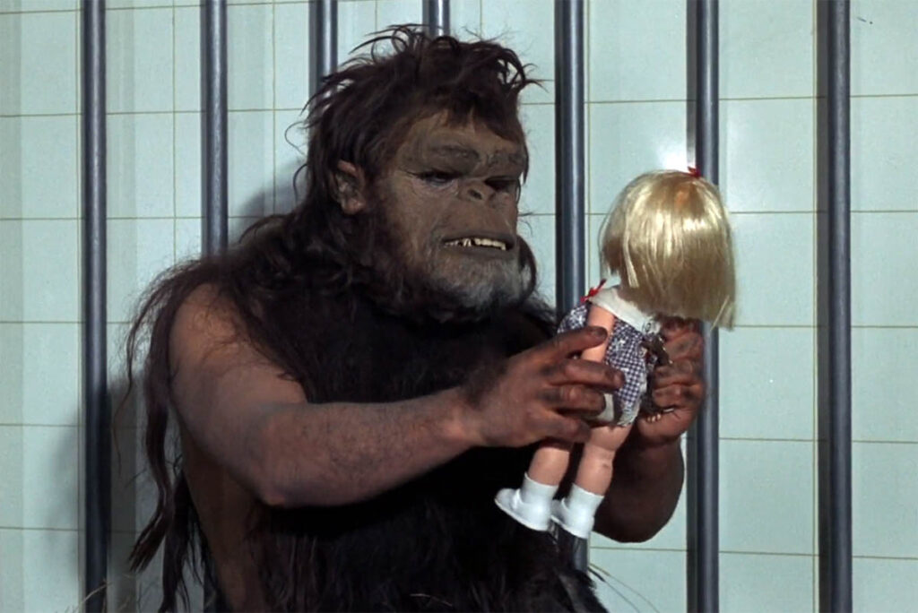 En découvrant la bête dans son repaire, Brockton identifie un troglodyte, ou Trog, c’est à dire une créature mi-homme mi-singe. « La plus grande découverte de la civilisation moderne », selon elle. Face aux caméras de la télévision et sous les yeux de nombreux curieux, le monstre est traqué par les autorités qui cherchent à le faire sortir. Mais le Trog s’échappe en semant la panique. Brockton parvient cependant à l’endormir avec des flèches tranquillisantes et à le mettre en cage dans son laboratoire pour l’étudier. « À une époque où l’homme est capable d’envoyer une fusée vers la Lune, je crois que nous devrions clarifier l’histoire de l’origine de l’homme », dit-elle à ses collègues scientifiques. Mais Trog va-t-il rester longtemps en captivité ? Le spectateur se doute bien que non. Si les scènes de spéléologie et le décor de la grotte, qui occupent dix minutes en début de métrage, ancrent le récit dans une atmosphère réaliste, toute crédibilité s’évapore dès que paraît la créature. Conçu par Charles Parker à partir d’un vieux costume récupéré sur le plateau de tournage de 2001 l’odyssée de l’espace, le Trog ressemble clairement à ce qu’il est : un acteur (en l’occurrence le catcheur Joe Cornelius) affublé d’un masque en caoutchouc et d’une peau de bête velue. Énervé par les flashs des appareils photos (comme King Kong) et peu amateur de rock’n roll, notre chaînon manquant s’apaise en revanche en écoutant de la musique classique et en jouant à la poupée !