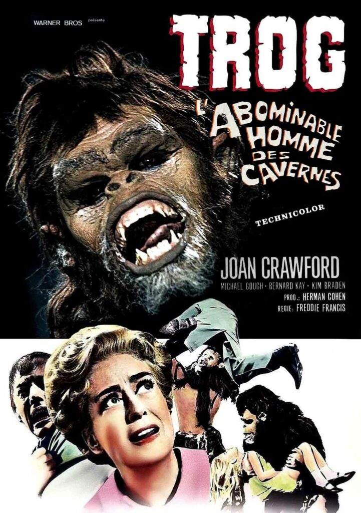 Élaboré autour d’une histoire originale de Peter Biyan et John Gilling, Trog est au départ un projet destiné au producteur Tony Tenser pour la compagnie Trigon, mais ce dernier préfère vendre le projet à son collègue Herman Cohen. Pour pouvoir bénéficier d’une tête d’affiche, Cohen contacte sa vieille amie Joan Crawford, alors en fin de carrière, avec qui il vient de tourner Le Cercle de sang. La mise en scène échoit au vétéran Freddie Francis, talentueux directeur de la photographie et réalisateur spécialisé dans l’épouvante (L’Empreinte de Frankenstein, Le Train des épouvantes, Le Crâne maléfique, Dracula et les femmes). Une fois l’équipe au complet, le tournage de cette histoire de chaînon manquant peut commencer. Au début de Trog, trois étudiants férus de spéléologie explorent une grotte souterraine et y découvrent une sorte de primate agressif qui tue l’un d’eux. Crawford incarne le docteur Brockton, une célèbre anthropologue. Fascinée par le témoignage des deux rescapés, elle les prend en charge. Profondément traumatisé, Cliff (John Hamill) est alité et se contente de répéter « horrible », couvert de sueur. Son collègue Malcolm (David Griffin), de son côté, postule pour être son assistant, le temps que la police boucle son enquête. Il accepte même de la conduire jusque dans la fameuse grotte pour retrouver la trace de la créature.