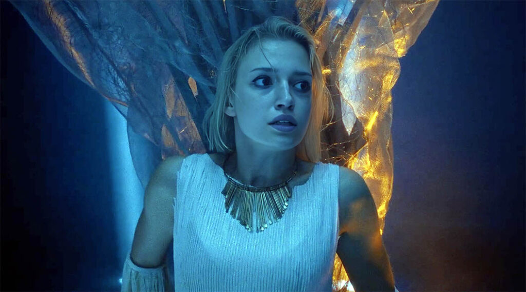 Pour son premier long-métrage, le réalisateur Dawid Torrone entend bien frapper fort en proposant quelque chose de nouveau sur le marché du cinéma polonais, tout en rendant hommage aux films de genre qu’il chérit tant. Et si le titre international Dead By Dawn évoque naturellement Evil Dead 2, c’est surtout du côté de l’Europe – et tout particulièrement de l’Italie – que Torrone puise son inspiration, au point de ranger son film dans une catégorie imaginaire qu’il surnomme avec auto-dérision « Giallo Pollo ». Dead By Dawn s’affirme donc comme un « giallo polonais », empruntant aux œuvres de Mario Bava et Dario Argento le caractère baroque de ses scènes de meurtres tout en se fendant de plusieurs références frontales. Le scénario s’appuie ainsi sur le même dispositif narratif que celui de Bloody Bird, tandis que le dernier acte reprend sans vergogne l’un des motifs visuels les plus fameux de Terreur à l’opéra. Tourné majoritairement dans le Palais de la Culture de Zagłębie, dont l’architecture monumentale offre à l’intrigue un écrin propice à l’exubérance dramaturgique, Dead By Dawn joue la carte de l’unité de lieu, de temps et d’action en gorgeant son atmosphère de tension, nuit d’orage à l’appui.