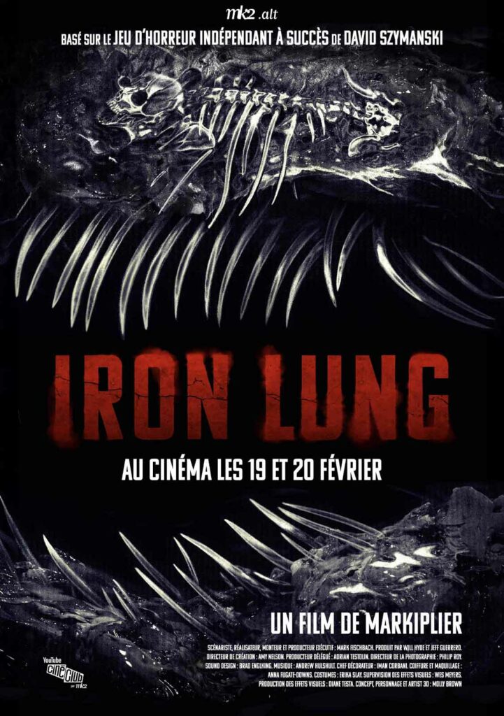 Contrairement au jeu, d’autres personnages que le détenu enfermé dans son submersible apparaissent dans Iron Lung, mais surtout sous forme de voix off (à travers les fragiles canaux de communication installés à bord) ou de silhouettes derrière le hublot. Le reste du temps, Markiplier occupe tout l’écran et nous sert donc d’unique pole d’identification. Il faut moins y voir un « ego trip » qu’une pleine implication de l’acteur/réalisateur, manifestement trop heureux de pouvoir concrétiser son rêve à l’écran. Iron Lung est pétri de qualités et d’audaces : son design rétro-futuriste, son atmosphère oppressante, ses connotations lovecraftiennes, sa mise en scène solide et inventive. Il faut aussi saluer l’extrême radicalité du concept, qui consiste à enfermer les spectateurs avec un personnage unique pendant toute la durée du film – comme jadis Mélanie Laurent dans Oxygène ou Ryan Reynolds dans Buried. La musique électronique d’Andrew Hulshult, l’appareil photo qui saisit les immenses clichés rétroéclairés d’un inquiétant squelette surdimensionné, le sang qui commence à s’immiscer partout dans les coursives sont autant de gimmicks qui contribuent à renforcer le caractère anxiogène du récit. Mais avec ses 125 minutes, Iron Lung joue les prolongations avec excès et finit par susciter une sacrée dose de patience. Car le spectacle est somme toute limité en termes de situations et de rebondissements. Ce travers est d’autant plus étonnant qu’une partie d’Iron Lung se joue en trois-quarts d’heure à peine. Cette première œuvre n’est donc pas exempte de maladresses, mais son audace et son culot forcent le respect.