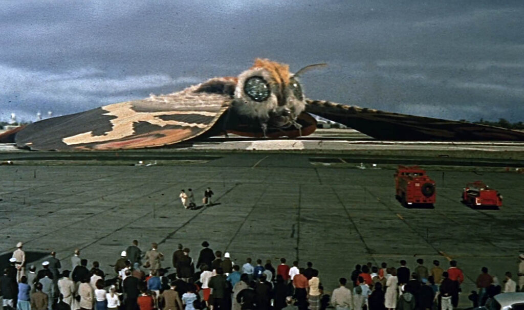 Des séquences particulièrement ambitieuses se succèdent tout au long du film : la chenille géante qui dévaste un paquebot en pleine mer, les avions qui la bombardent au milieu de l’océan, la destruction du barrage, l’attaque et l’effondrement de la Tour de Tokyo… Le spectacle est donc total, soutenu par un impressionnant travail de maquettes supervisé, comme toujours, par Eiji Tsuburaya. Certes, toutes ne sont pas pleinement convaincantes – les tanks et leurs conducteurs aux allures de jouets, les immeubles qui fleurent bon le carton – mais le charme demeure intact. Pour pleinement apprécier Mothra, il faut bien sûr accepter son côté délicieusement « pulp » : ces danses tribales d’indigènes qui ressemblent à des numéros de music-hall, ces chanteuses microscopiques qui minaudent dans leur carrosse doré, cet œuf géant d’où surgit la mignonne chenille titanesque à la bouille arrondie… Sans compter les prestations caricaturales de Jerry Itô, qui fronce des sourcils et ricane pour nous faire comprendre qu’il est très méchant, ou de Furankî Sakai, qui exagère sa bonhommie rondouillarde pour nous faire sourire. Mais pour peu qu’on se prête au jeu, le film dégage une grande poésie et développe une intéressante opposition entre la cupidité humaine (volontiers masculine) et la force de la Nature (associée ici à la féminité). Quant à la métamorphose tant attendue au cours de laquelle la chenille prend sa forme majestueuse de gigantesque papillon multicolore, c’est un des moments les plus mémorable de l’histoire du « kaiju eiga ». Le succès colossal du film poussera la Toho à faire revenir l’insecte protecteur dans Mothra contre Godzilla.