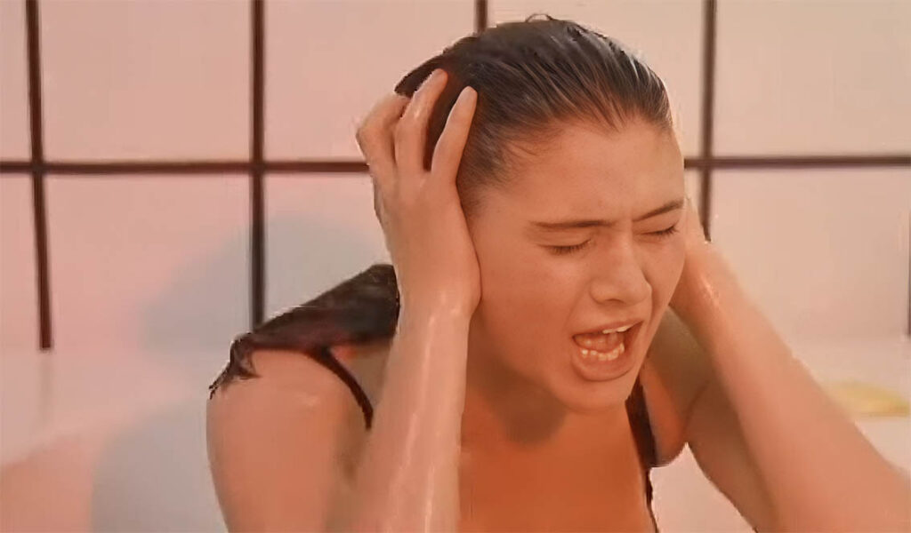 Les amateurs de cinéma fantastique se souviennent du joli minois de Charlotte Lewis, qui partageait la vedette avec Eddie Murphy pour sauver « l’enfant sacré du Tibet » dans Golden Child. Mais avec Angoisse sur la ligne, nous changeons clairement de registre. Si le surnaturel est toujours de la partie, le public visé est beaucoup plus adulte, ce vieux roublard de Ruggero Deodato ayant décidé de tout miser sur le physique de son actrice/mannequin et de concocter un étrange thriller érotico-horrifique. L’homme par qui arriva le scandale, à l’époque de Cannibal Holocaust, suit comme souvent les phénomènes de mode. Après avoir sacrifié aux vogues successives des films catastrophe (S.O.S. Concorde), des aventures post-apocalyptiques (Les Prédateurs du futur), des slashers (Body Count) ou de l’heroic-fantasy (Les Barbarians), il arpente la voie de ce qu’on pourrait appeler le « neo-giallo », inspiré tardivement par les classiques de Mario Bava et Dario Argento. Cette tendance, à laquelle il s’essaya en 1987 avec Le Tueur de la pleine lune, se poursuit à l’occasion d’Angoisse sur la ligne, dont le scénario ne recule devant aucune aberration pour tenter de secouer les spectateurs.
