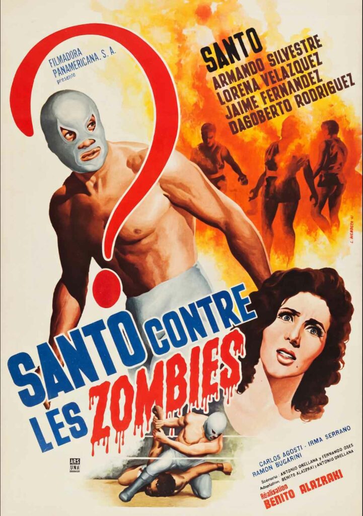 Au Mexique, la « lucha libre » est une institution depuis la fin des années 1800. Ce catch folklorique, que pratiquent des belligérants souvent affublés de masques colorés, favorise les prises spectaculaires, les sauts périlleux et les plongeons foudroyants. Il faut que le public en ait pour son argent. Au sein de cette discipline, un nom s’est érigé à la fois comme un symbole et une véritable légende : Santo. De son vrai nom Rodolfo Guzman Huerta, ce célèbre lutteur masqué est né en 1917 et décroche son premier titre en 1943. Classé dans la catégorie des « rudes » (autrement dit les « méchants » du ring), le massif catcheur change ses techniques de lutte en cours de route pour se ranger du côté des « bons », dans la mesure où sa cote de popularité ne cesse de grandir. Et bientôt, notre homme exporte son image bien au-delà des salles de combat. D’abord héros de photoromans, il poursuit ses exploits au cinéma et devient la star d’une bonne cinquantaine de films tournés sur une période de plus de vingt ans. Les deux premiers longs-métrages dans lesquels il figure, Cerebro del Mal et Cargamento Blanco, ne lui donnent pas encore la vedette, puisqu’il y partage l’affiche avec d’autres justiciers masqués. Mais dès le troisième, Santo contre les zombies, le voilà propulsé sur le devant de la scène, en accord avec la nouvelle image de « super-héros » qu’il se donne sur le ring.