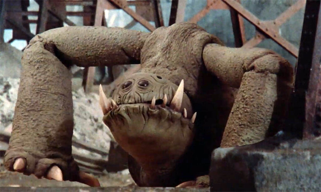 « Il y avait plusieurs créatures intéressantes en stop-motion dans Mutant War », reconnaît Piper. « L’une d’elles ressemblait un peu au monstre que Jim Danforth avait animé pour un spot publicitaire d’Armor All, les autres étaient des créatures géantes sorties tout droit de mon imagination. L’une d’entre elles était assez ridicule, je dois bien l’avouer ! Nous l’avions surnommée Goofy. Il faut dire que je fabriquais les figurines en deux ou trois jours, pas plus. » (2) C’est dans une cité sinistre hantée par des rescapés difformes que nos héros croisent le chemin de ce fameux Goofy, une créature improbable qu’on croirait échappée du jeu d’échecs de La Guerre des étoiles. Pataud, le monstre avance sur deux pattes de pachyderme et agite sa grosse tête de reptile aux petits yeux noirs et à la gueule garnie de crocs immenses. Les maquettes sont également mises à contribution pour brosser quelques tableaux joliment surréalistes, comme les bâtiments étranges qui surgissent au milieu de la campagne blême (filmée en extérieurs dans le New Hampshire) ou ce vaisseau spatial qui atterrit au beau milieu de l’intrigue pour tenter de la relancer. Tourné en 35 mm, contrairement à son prédécesseur qui employait le format 16 mm, Mutant War aura droit à une discrète exploitation sous des titres variés tels que Galaxy Destroyer 2 ou le très poétique Mutant Men Want Pretty Women !