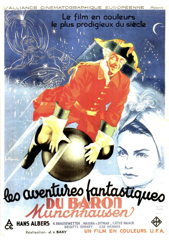 Les Aventures fantastiques du Baron Münchhausen reste l’un des exemples les plus spectaculaires du cinéma de fantaisie produit en Allemagne pendant la Seconde Guerre mondiale. Mais c’est aussi une œuvre profondément paradoxale qu’il n’est pas simple d’extraire de son contexte historique. S’inspirant des récits légendaires de Karl Friedrich Hieronymus von Münchhausen – officier et aventurier du XVIIIᵉ siècle connu pour s’être attribué des exploits invraisemblables – le film a été commandité à l’initiative de Joseph Goebbels dans le cadre de la commémoration du vingt-cinquième anniversaire de la UFA et pour remonter le moral des troupes. Or cette épopée fantastique s’affranchit de tout message politique, optant pour un divertissement féerique d’une inventivité technique impressionnante. Le récit commence au XXᵉ siècle, lors d’un bal donné par le Baron von Münchhausen dans son château de Bodenwerder. Il y reçoit un jeune couple curieux de connaître l’histoire de son illustre ancêtre. À travers les souvenirs du baron, le spectateur est entraîné dans une succession de péripéties délirantes. Nous y découvrons la séduction de Catherine II de Russie, la rencontre avec le magicien Cagliostro et l’acquisition de la jeunesse éternelle ainsi que d’un anneau d’invisibilité, mais aussi la traversée d’un champ de bataille sur un boulet de canon, l’emprisonnement dans les geôles d’un sultan turc, les affrontements avec les sbires du doge en plein Venise, ainsi qu’un spectaculaire périple lunaire où des Sélénites sont capables de détacher leur tête du reste du corps.