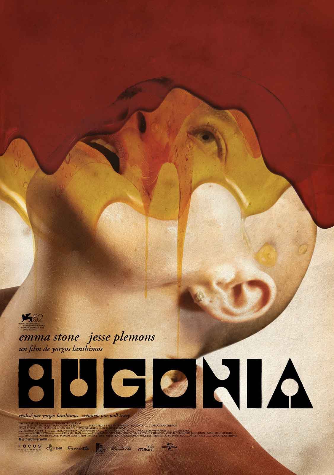 Bugonia est un remake de Save the Green Planet, que le cinéaste sud-coréen Jang Joon-hwan réalisa en 2003. Cette nouvelle version devait initialement être dirigée par le metteur en scène original. Mais suite à des problèmes de santé, Jang Joon-hwan cède sa place. C’est là qu’entre en scène Yorgos Lanthimos. Sous ses allures austères (un poster hideux, un titre nébuleux), Bugonia est probablement le long-métrage le plus accessible de ce cinéaste dont on ne sait honnêtement trop quoi penser. Entre une posture « auteurisante » parfois prétentieuse, une tendance à se placer au-dessus du genre fantastique pour défendre des sujets sociétaux pas toujours très limpides et des prises de position politiques discutables mais confortables parce que « dans l’air du temps », l’homme divise. Rien n’empêche d’ailleurs de penser qu’il provoque souvent volontairement la controverse. Heureux de ses collaborations successives avec Emma Stone (La Favorite, Vlihi, Pauvres créatures, Kinds of Kindness), le réalisateur la remet ici sous le feu des projecteurs dans un rôle qui nécessite une pleine implication physique, y compris un rasage de crâne en direct, dans la droite lignée de celui de Sigourney Weaver dans Alien 3 ou de Demi Moore dans À armes égales. Le scénario écrit par Will Tracy réorganisant les événements du film coréen, Stone entre dans la peau de Michelle Fuller, puissante présidente de la méga-entreprise pharmaceutique Auxolith.