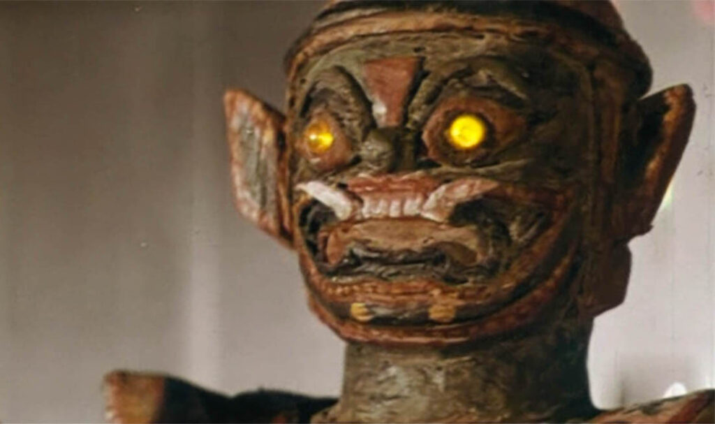 La première moitié des Hommes d’une autre planète s’intéresse à un jeune garçon qui, en voulant récupérer une balle égarée pendant une partie de base-ball, se retrouve dans un temple antique et aperçoit dans un souterrain une pierre émettant une lumière aveuglante qui lui fait perdre connaissance. Lorsqu’il revient à lui, il découvre une statuette vieille de 3000 ans représentant Yak Wat Jang, le « Gardien du Temple ». Pendant ce temps, son grand-père découvre à la télévision un message pirate diffusé par de vils extra-terrestres qui ont décidé d’envahir la Terre. Pour convaincre la population de la véracité de cette menace, le roi des Martiens (avec son masque figé et sa grande perruque rousse) s’agite aux côtés de son premier ministre (engoncé dans une combinaison digne d’un épisode de Spectreman). Leur objectif est de récupérer la « Pierre Solaire » qui est censée leur permettre d’activer une arme terrifiante depuis la base qu’ils ont installée sur la Lune. Or cette pierre est justement celle que l’enfant a vue sous terre. Soudain, la statuette émet un rayon radioactif qui contamine le garçon et son grand-père, lesquels partent à l’hôpital et disparaissent dès lors complètement du film. Car la seconde moitié délaisse quasi-totalement les personnages humains pour se concentrer sur les grosses bébêtes.