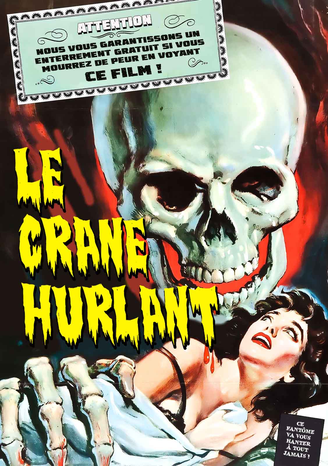Le scénario s’avère assez bien ficelé, garni de répliques qui font mouche (« on se crée une prison en vivant dans les regrets du passé ») mais un tel sujet aurait mérité un travail beaucoup plus minutieux sur l’atmosphère et la mise en forme pour fonctionner correctement. Or la mise en scène s’avère désespérément académique, la photographie sans relief, les décors dénués de caractère. Le Crâne hurlant reprend ainsi les codes du cinéma gothique sans se donner les moyens de lui offrir l’écrin nécessaire. Il faut tout de même saluer les efforts du compositeur Ernest Gold (qui sera oscarisé deux ans plus tard pour la célèbre bande originale d’Exodus). Modulant habilement sa musique pour évoquer toute la palette d’émotions frappant les personnages, il passe en quelques secondes de l’ambiance guillerette à la tension ou au mystère, tout en expérimentant de nombreuses variantes sur la « Symphonie Fantastique » d’Hector Berlioz (tout particulièrement le « Songe d’une nuit de Sabbat ». A ces compositions s’ajoutent les cris nocturnes des paons, le vent dans les branches, les volets qui claquent ou encore les pas dans les couloirs, contribuant à créer une ambiance sonore lugubre. Très inspirée des facéties du cinéaste William Castle, la publicité de l’époque affirmait qu’un enterrement était offert à toute personne qui mourait de peur pendant le film ! Personne n’eut besoin de réclamer ce prix macabre, Le Crâne hurlant n’ayant reçu qu’un accueil mitigé lors de sa sortie.
