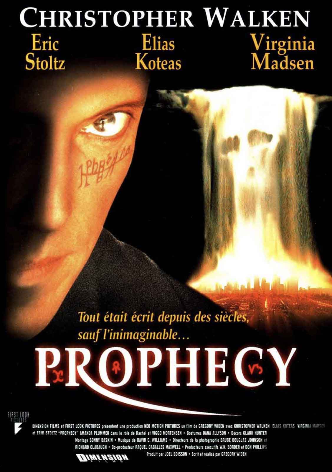 Gregory Widen était sorti de l’anonymat en écrivant le scénario d’Highlander. Après avoir transformé cet essai magistral avec le script de Backdraft, il décide de passer lui-même à la mise en scène. Il effectue son baptême derrière la caméra grâce à la série Les Contes de la crypte puis prépare son premier long-métrage, une histoire d’anges déchus inspirée par le poème « Le Paradis perdu » de John Milton. Le producteur Joel Soisson a le coup de foudre pour le scénario atypique que lui fait lire Widen et lui donne aussitôt son feu vert. Provisoirement titré God’s Army pendant son tournage, Prophecy donne à Christopher Walken le rôle du maléfique ange Gabriel, bien décidé à anéantir l’humanité en s’opposant à son bénéfique alter-ego Simon, incarné par Eric Stoltz. Cette lutte surnaturelle est arbitrée par le policier Thomas Dagget (Elias Koteas), puis par Lucifer en personne, à qui Viggo Mortensen prête ses traits longtemps avant de passer à la postérité avec Le Seigneur des Anneaux. À ce casting de choix s’ajoute la présence toujours réjouissante de Virginia Madsen (Candyman), enseignante devenue malgré elle témoin de cet affrontement dantesque entre le Bien et le Mal. Amanda Plummer et Adam Goldberg complètent le tableau dans le rôle de suppôts de Gabriel.