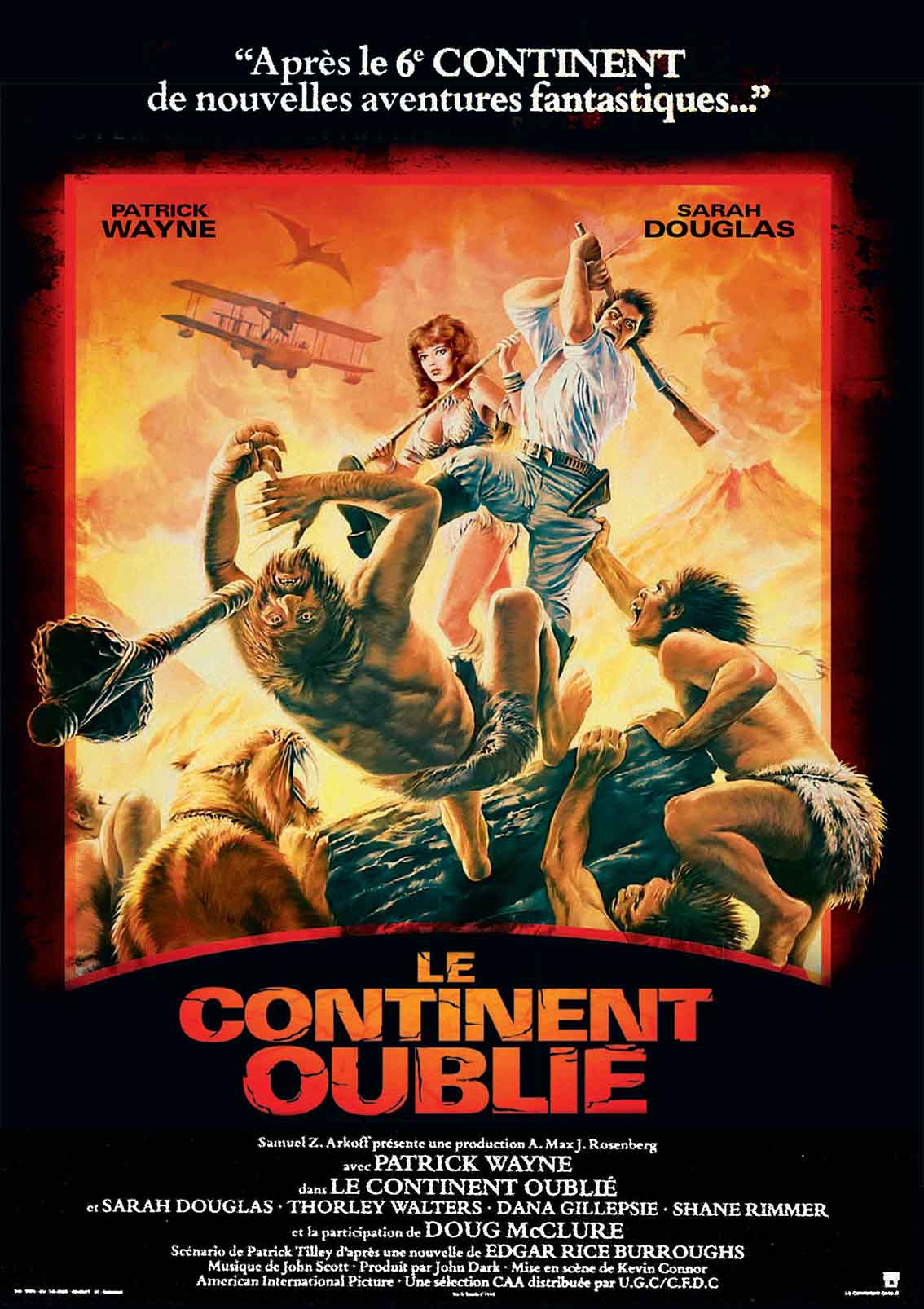 Après Le Sixième continent et Centre terre : septième continent, Kevin Connor et ses producteurs se lancent dans Le Continent oublié, une troisième aventure inspirée des écrits d’Edgar Rice Burroughs qui prend directement la suite des événements racontés dans Le Sixième continent. Adapté du second volume du cycle « Caspak », « Le peuple que le temps avait oublié », le film est tourné à Santa Cruz de la Palma (pour les extérieurs) et aux studios Pinewood (pour les intérieurs). La jolie maquette d’un navire évoluant devant de beaux glaciers en matte painting ouvre le film. Nous apprenons qu’une expédition financée par un grand journal s’est montée pour retrouver la trace de Bowen Tyler (le héros du premier film), après qu’une bouteille contenant le récit de ses aventures ait été découverte au large de l’Ecosse. Une fois qu’ils ont gagné l’Antarctique en bateau, le commandant Ben McBride (Patrick Wayne), la journaliste Charly Cunningham (Sarah Douglas), le biologiste Edwin Norfolk (Thorley Walters) et le mécano Hogan (Shane Rimmer) s’envolent en hydravion au-delà d’une impressionnante barrière rocheuse, aux accents d’une partition épique de John Scott. En plein ciel, ils sont attaqués par un ptérodactyle vindicatif qui finit par se blesser mortellement dans l’hélice de l’avion et provoque leur atterrissage en catastrophe. Malgré la maquette peu convaincante du biplan et la marionnette figée du reptile volant, la séquence (qui semble héritée du projet avorté de la Hammer « Zeppelins vs. Pterodactyls ») fonctionne bien grâce à l’habileté de son montage.