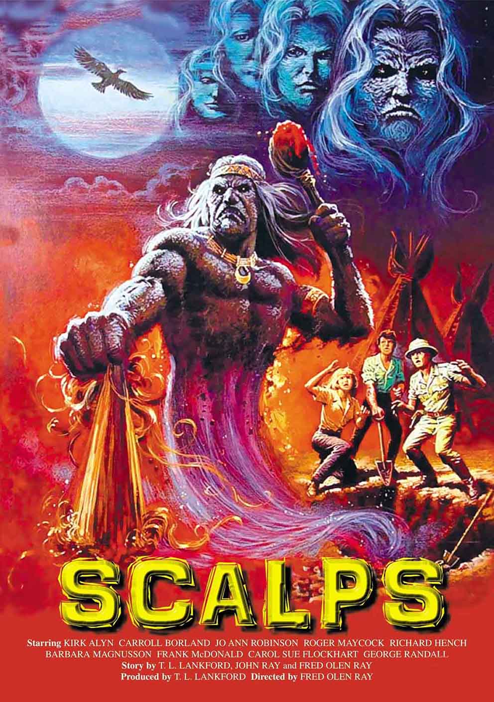 Très amateur dans sa facture (la photographie, le montage, le jeu des acteurs), bourré de faux raccords, Scalps ne vaut vraiment le détour que pour ses effets gore et ses maquillages spéciaux, conçus par Chris Biggs (La Galaxie de la terreur), John McCallum (Biohazard) et Bart J. Mixon (le téléfilm Ça). Certes, nous ne sommes pas dans la grande finesse, mais cet Indien monstrueux au visage ensanglanté fait son petit effet, tout comme ces meurtres saignants qui évoquent les travaux de Tom Savini (égorgements, scalps en gros plan, décapitations) ou ces images choc qu’on croirait échappées d’un film d’horreur italien (le gros rat qui se promène sur le crâne d’un cadavre desséché). On ne peut pas en dire autant de cet étrange prêtre à tête de lion qui retrousse ses babines mécaniquement et qui intervient régulièrement de manière totalement inexplicable. Il faut dire que ces plans répétitifs – qui n’étaient au départ que des tests d’effets spéciaux conçus pour n’apparaître que très furtivement – ont été ajoutés artificiellement par les distributeurs sans le consentement de Fred Olen Ray. En effet, ce dernier ignorait qu’en signant avec la compagnie 21st Century Film Corporation, il leur cédait les droits de remanier totalement le montage. D’où l’insertion aléatoire de plans horrifiques dans un ordre étrange qui ne respecte ni la logique ni la chronologie du récit. Mais il faut bien reconnaître que Scalps est lent et désespérément vide de péripéties pendant sa première heure. Ce remontage bizarre – abusant de flash-forwards souvent incompréhensibles – joue finalement presque en faveur du film, concourant à l’établissement d’un climat malsain et oppressant.