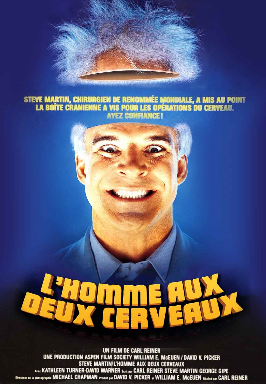 Rob Reiner a tant séduit les cinéphiles à travers sa filmographie riche et éclectique (Stand by Me, Princess Bride, Quand Harry rencontre Sally, Misery, Des Hommes d’honneur) qu’il en a presque éclipsé l’œuvre impressionnante de son père. Les talents multiples de Carl Reiner (acteur, réalisateur, producteur, scénariste écrivain) se sont pourtant déployés pendant sept décennies, placées principalement sous le signe de la comédie. Son septième long-métrage en tant que metteur en scène, Les Cadavres ne portent pas de costard, fut un beau succès critique et public. Il faut dire que le concept avait de quoi séduire les cinéphiles de tous poils : dans le rôle d’un détective privé à l’ancienne, le comédien Steve Martin y menait une enquête loufoque en croisant les plus grandes stars des années 40, grâce à un montage virtuose lui permettant d’interagir avec des extraits empruntés à une vingtaine de classiques du film noir. Michel Hazanivicius et Dominique Mézerette s’en souviendront lorsqu’ils concocteront le cultissime film patchwork La Classe américaine. Sur sa lancée, Carl Reiner décide de reformer le trio gagnant des Cadavres… en co-signant un nouveau scénario parodique avec George Gipe et Steve Martin, ce dernier étant une fois de plus réquisitionné pour jouer le rôle principal. Après les films noirs, ce sont les séries B de science-fiction qui sont dans la ligne de mire des trois auteurs, et tout particulièrement Donovan’s Brain dont il reprend l’argument principal. La référence est assumée par un extrait diffusé sur un téléviseur, le héros avouant aussitôt qu’il s’agit de son film préféré.