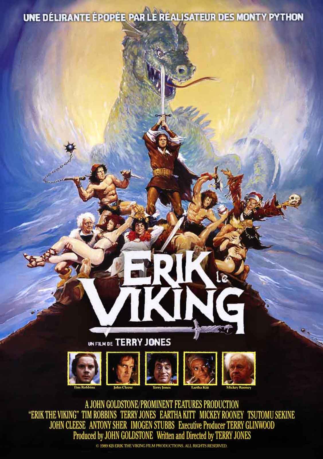 Tom Hulce avait déjà signé pour le rôle principal, mais lorsque la production put enfin démarrer, il prit congé des plateaux de cinéma pour se focaliser sur le théâtre. Alors que Terry Jones avait toujours envisagé Erik comme un petit personnage au milieu de vikings plus costauds que lui, il engagea néanmoins le jeune Tim Robbins, frais émoulu de Howard : une nouvelle race de héros et Top Gun, qui, du haut de ses presque deux mètres, donne au personnage une allure dégingandée encore plus inadaptée. Le concept de mise en scène initial de Terry Jones consistait à filmer le début de l’histoire en décors naturels en Norvège, puis à évoluer graduellement vers des décors en studio à mesure que les vikings s’aventuraient loin de chez eux, pour conférer à leur quête une dimension plus fantasmagorique. Malheureusement, le village Viking dut finalement être érigé en studio. L’évolution tonale, moins marquée, se ressent néanmoins grâce à une direction artistique soignée que signent notamment Gavin Bocquet, futur directeur artistique des préquelles de La Guerre des étoiles, et Alan Lee, l’incontournable illustrateur du Seigneur des Anneaux. Les effets spéciaux possèdent une facture volontairement rudimentaire et artisanale, l’idée primant sur le réalisme. On retiendra quelques jolies scènes comme l’arrivée du drakkar au bout du monde (puisque la terre est plate évidemment), la découverte du Valhalla où les dieux sont incarnés par des enfants, un combat contre un dragon marin savamment caché dans la brume et la submersion d’une ville entière dont le décor use adroitement de la perspective forcée. Chaque séquence peut être vue comme un chapitre des histoires illustrées dont s’inspire le film, mais certains critiques reprochèrent plutôt à Erik le Viking de ressembler à une succession de sketches, un écueil attribuable aux années passées à travailler dans ce format avec les Monty Python. A vrai dire, Terry Jones semble avoir eu du mal à trouver le bon rythme au montage. En guise d’aveu déguisé, il écourta son film de 17 minutes pour sa sortie en VHS en 1990 (le ramenant à une durée de 89 minutes), puis laissa son fils l’élimer encore un peu en 2006 pour une version « Director’s son’s cut » de 75 minutes en DVD. Mais quelle que soit la version, Terry Jones a atteint son objectif : son film respire l’innocence en évitant toute mièvrerie et offre au spectateur complice une parenthèse enchantée digne du Princess Bride de Rob Reiner.