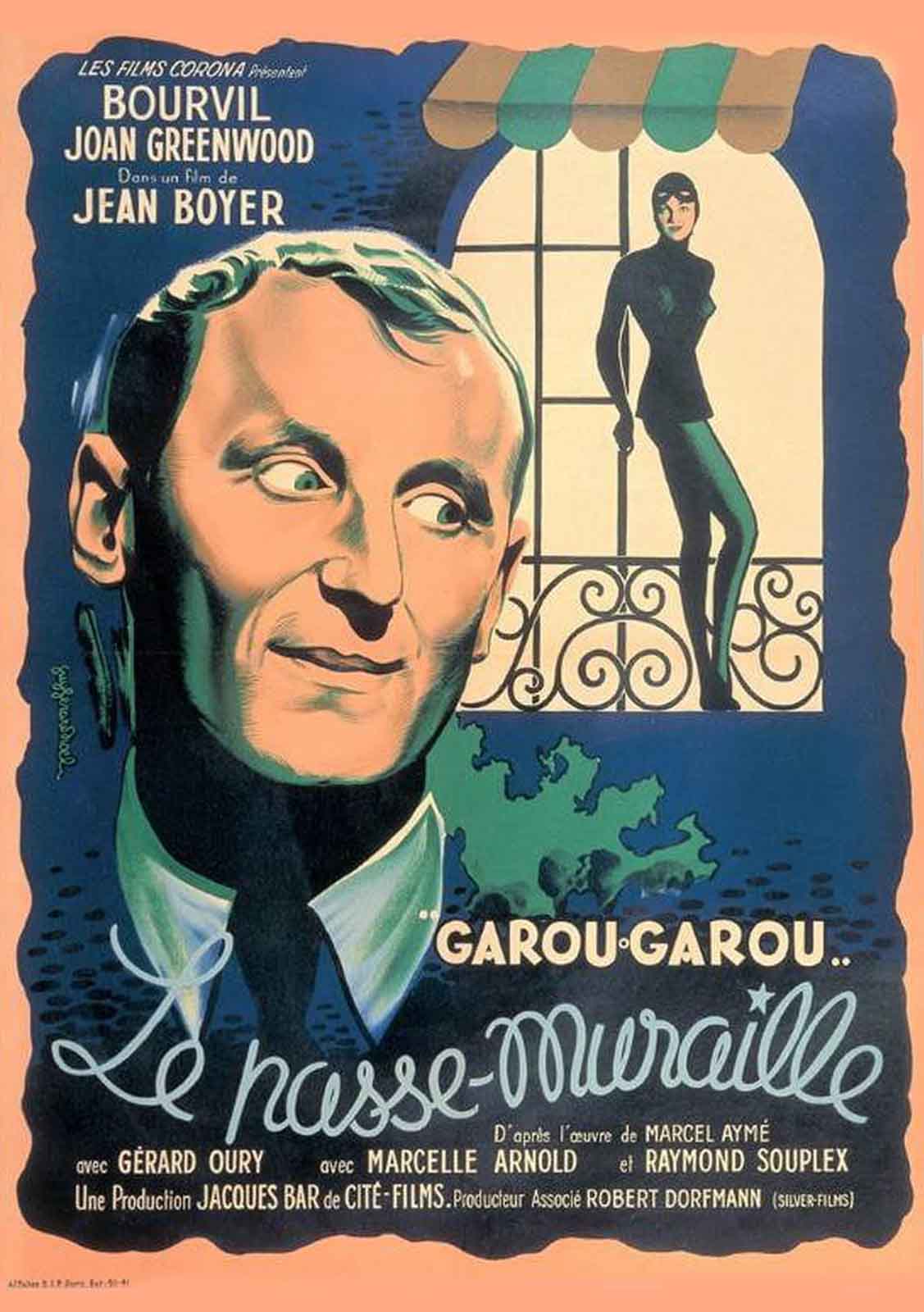 « Il y avait à Montmartre, au troisième étage du 75 bis de la rue d’Orchampt, un excellent homme nommé Dutilleul, qui possédait le don singulier de passer à travers les murs sans en être incommodé ». C’est sur ces mots que commence la nouvelle « Le Passe-Muraille » de Marcel Aymé, qui sera publiée une première fois en 1941 avant son intégration dans un recueil d’histoires courtes deux ans plus tard. En quelques mots, l’auteur banalise ainsi une situation extraordinaire pour mieux brocarder ses semblable, au sein de la période trouble de l’occupation qui imprègne fortement plusieurs de ses récits de l’époque. Séduits par « Le Passe-Muraille », le réalisateur Jean Boyer et le scénariste Michel Audiard décident de l’adapter pour le grand écran au début des années 50. Le texte original étant très court, ils le complètent de nouvelles séquences, agencent les événements différemment, modifient les attributs de plusieurs personnages et reconstruisent la personnalité et les caractéristiques physiques du héros pour les adapter à leur interprète Bourvil.