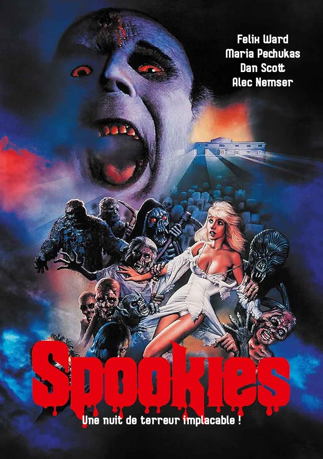 En s’installant dans le manoir, les nouveaux venus deviennent les proies d’une impressionnante collection de monstres tous plus bizarres les uns que les autres : un démon femelle hideux à la Evil Dead, des morts-vivants particulièrement dégoulinants, trois zombies difformes et boueux qui émettent des flatulences ridicules, le cadavre grimaçant d’une pendue, un affreux gremlin reptilien particulièrement vorace, une créature lovecraftienne et gluante dont les tentacules électrocutent et décomposent ceux qu’ils touchent, une statue de la Mort armée d’une faux, une sorcière qui crache du feu et, clou du spectacle, une séduisante Asiatique qui se transforme en araignée géante au cerveau hypertrophié… Dix minutes avant la fin, le film se débarrasse de tous ses protagonistes et se concentre alors sur Isabelle, enfin revenue parmi les vivants, qui prend la poudre d’escampette dans les bois et se retrouve coursée par des dizaines de zombies, jusqu’à un dénouement confinant au grand n’importe quoi. Du coup, Spookies s’apprécie principalement comme un train fantôme enchaînant à un rythme généreux les effets spéciaux rigolos et variés (maquillages spéciaux, marionnettes mécaniques, animation image par image, voire même grattage sur pellicule). L’emploi de la touche « accéléré » de la télécommande est donc vivement conseillé.