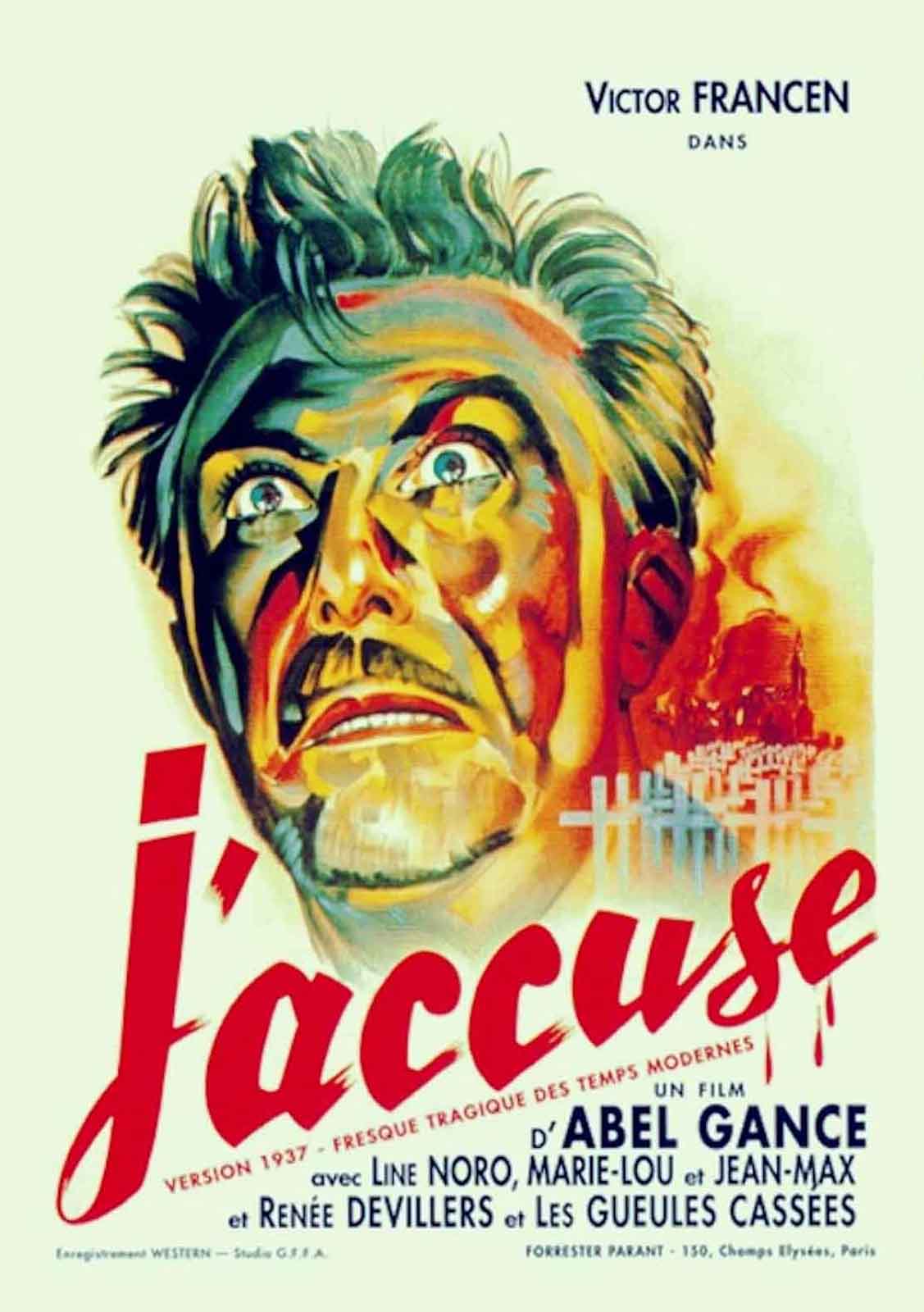 Quand Diaz s’exclame, le regard fou, « j’accuse les hommes de ne pas avoir tiré la leçon du gigantesque cataclysme et d’attendre les bras croisés qu’il recommence », cette colère face à l’éternelle absurdité de l’humanité semble bien être celle d’Abel Gance lui-même, qui transpose son utopie, sa hargne et son désespoir chez ce protagoniste tourmenté, que Francen joue avec une emphase étourdissante. L’entendre répéter en hurlant « J’accuse ! » avec dans les yeux un écarquillement digne de celui de Bela Lugosi procure un malaise grandissant. Progressivement, le film se dévêt de son enveloppe hyperréaliste pour tendre vers la politique fiction puis vers l’horreur dans ce qu’elle a de plus surnaturel. Mais pour brouiller les pistes, Gance sollicite de véritables « gueules cassées » qui offrent à la morbide sarabande finale (ancêtre des visions cauchemardesques que concocteront George Romero et Lucio Fulci) une tangibilité extrêmement inconfortable. Malgré cette solution de la dernière chance imaginée par un savant pacifiste au bout du rouleau, le final reste empli de désespoir, laissant augurer que même face à l’abomination l’homme ne retiendra rien et continuera à répéter les mêmes erreurs. La réalité rattrapera d’ailleurs la fiction. Vingt mois après la sortie de J’accuse ! sur les écrans, l’Allemagne envahit la Pologne et déclenche la seconde guerre mondiale…