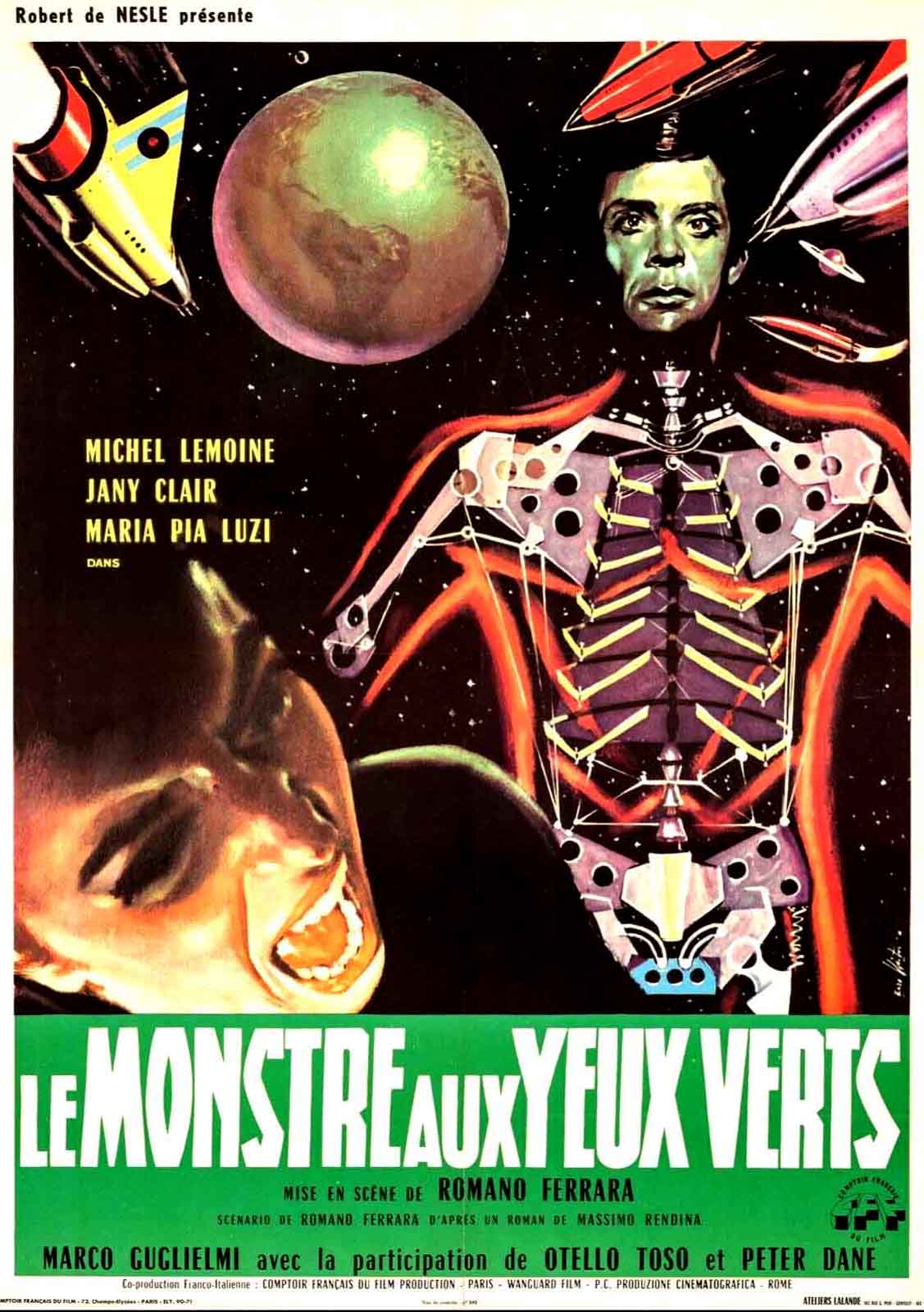 Co-production entre l’Italie, la France et l’Allemagne, Le Monstre aux yeux verts (dont le titre italien pourrait se traduire par « Les planètes contre nous ») est le premier long-métrage de Romano Ferrara, dont la modeste carrière de réalisateur n’a rien d’exceptionnel, si l’on excepte peut-être la sympathique aventure exotique Gungala, la vierge de la jungle. Co-écrite par Ferrara et Piero Pieriotti (Le Retour de Robin des Bois, La Ruée des Vikings), cette étrange fable de science-fiction s’inspire d’un roman de Massimo Rendina, surtout connu pour ses articles dans la presse italienne et pour ses engagements politiques antifascistes. Lorsque le film commence, l’avion qui transportait le professeur Landersen, spécialiste de l’atome, et son fils Robert s’écrase dans le désert du Sahara, ne laissant aucun survivant. Parallèlement, des vols spatiaux américains et soviétiques sont sabotés par une force mystérieuse et un homme inconnu est vu simultanément en plusieurs endroits éloignés de nombreux kilomètres. Fait encore plus surprenant : cet homme a les mêmes traits que le défunt Robert Landersen. En réalité, il s’agit d’un cyborg extra-terrestre au squelette métallique ayant imité des traits humains pour mieux s’intégrer parmi les habitants et fomenter de l’intérieur un complot d’outre-espace…
